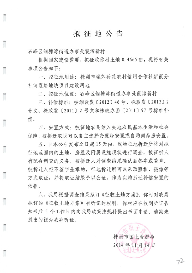 拟征地公告(城郊荷花农村信用合作社新霞分社铜霞路地块0.4665亩)