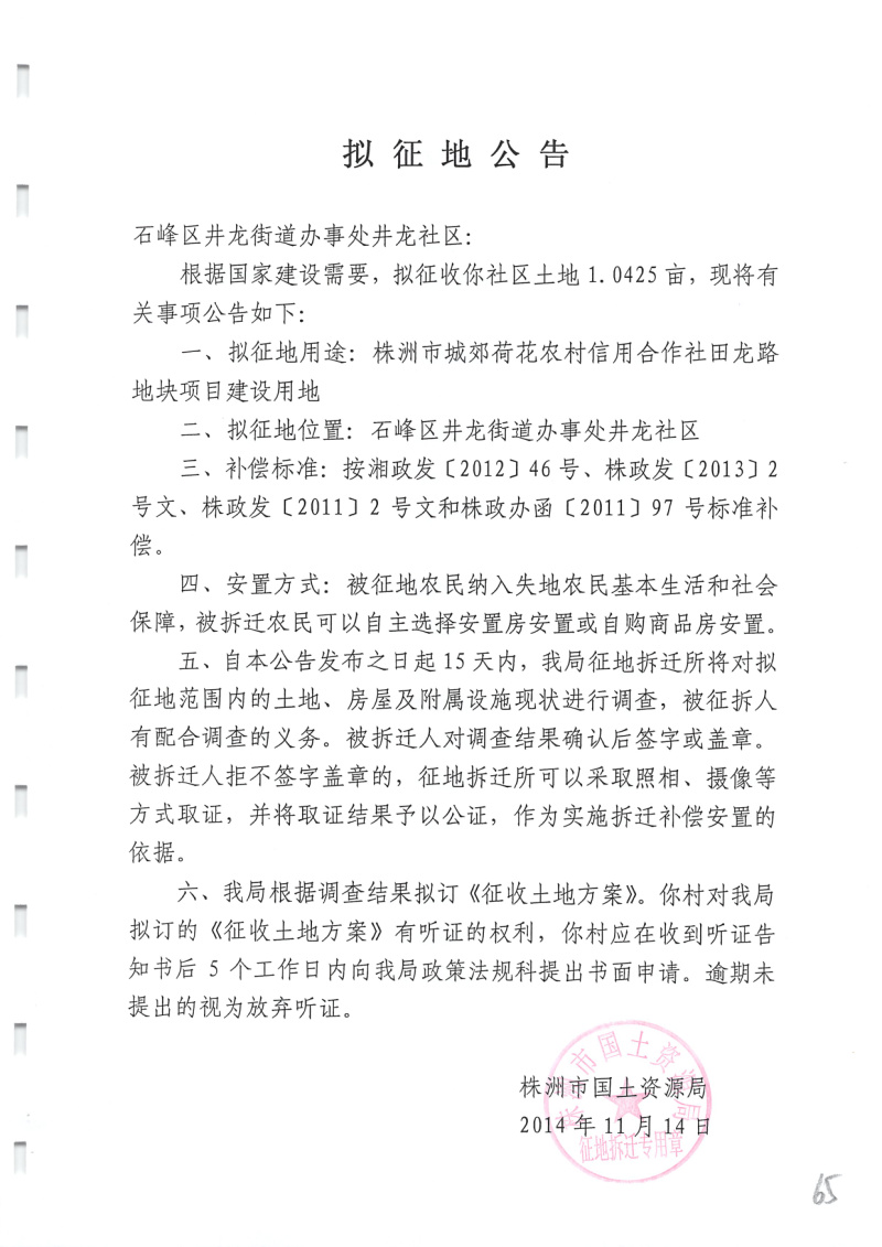 拟征地公告(城郊荷花农村信用合作社田龙路地块1.0425亩)