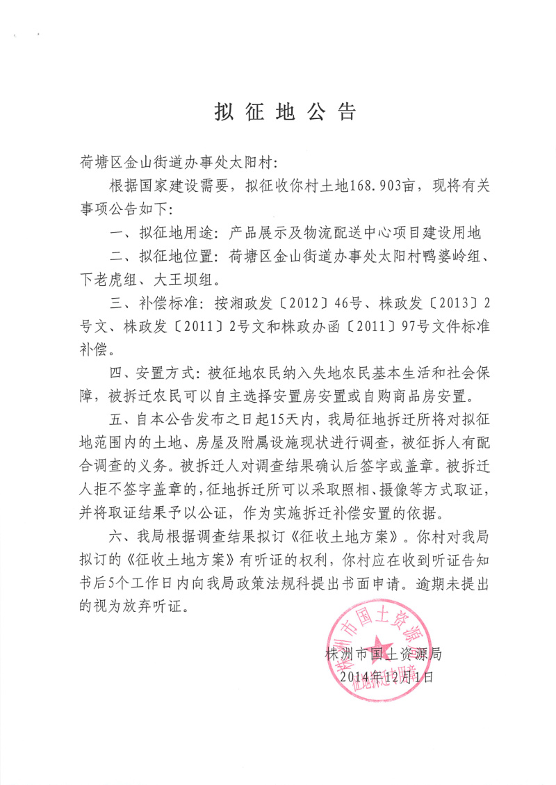 拟征地公告(产品展示及物流配送中心太阳村168.903亩)