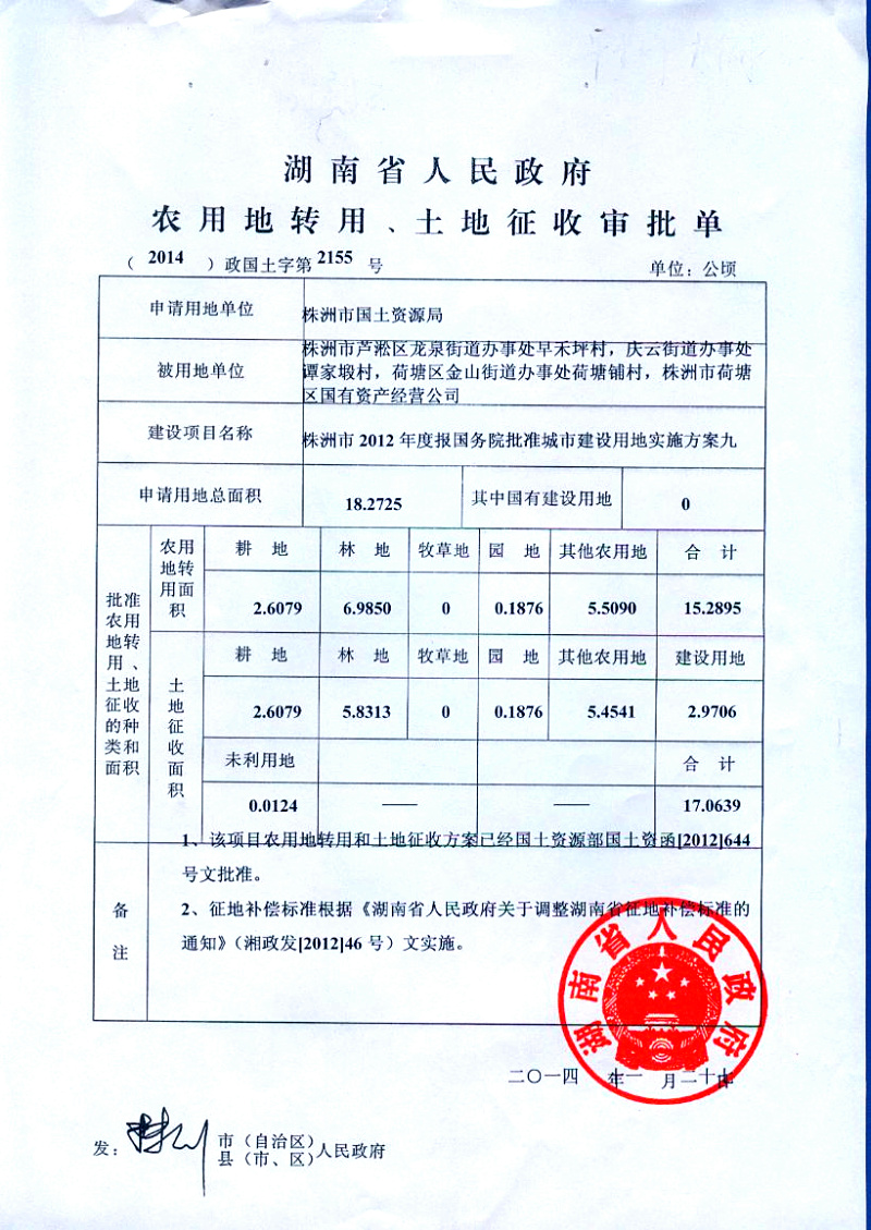 省政府农用地转用、土地征收审批单(2014)政国土字第2155号