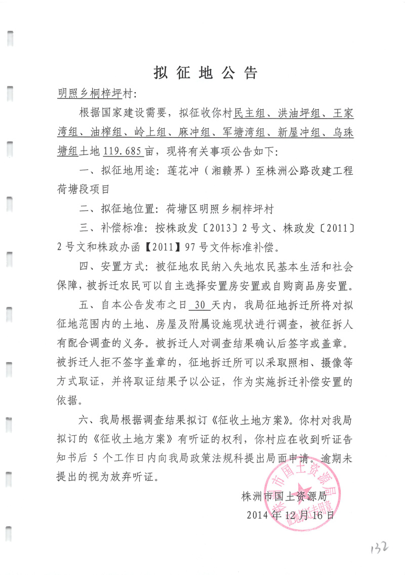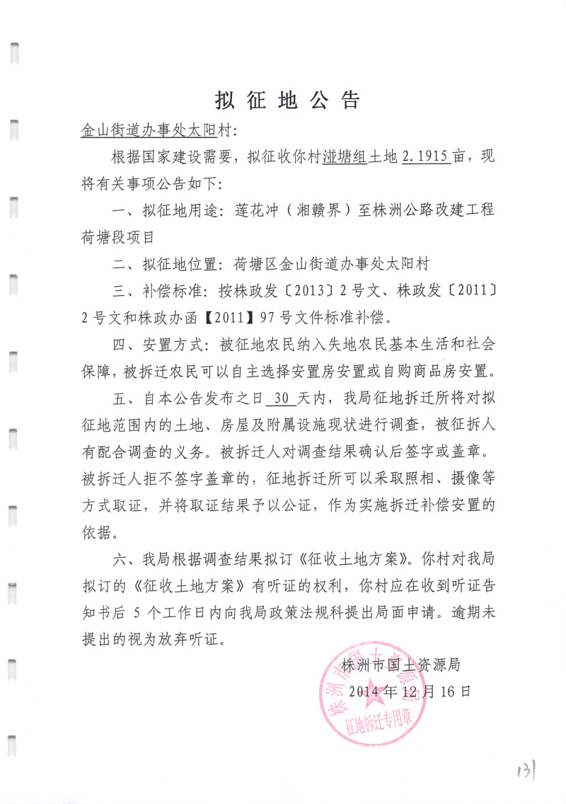 拟征地公告(莲花冲湘赣界至株洲公路改建工程荷塘段)