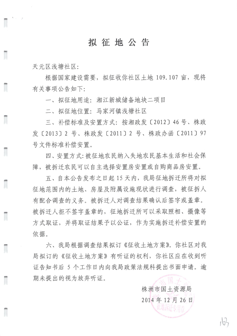 拟征地公告(湘江新城储备地块二109.107亩)