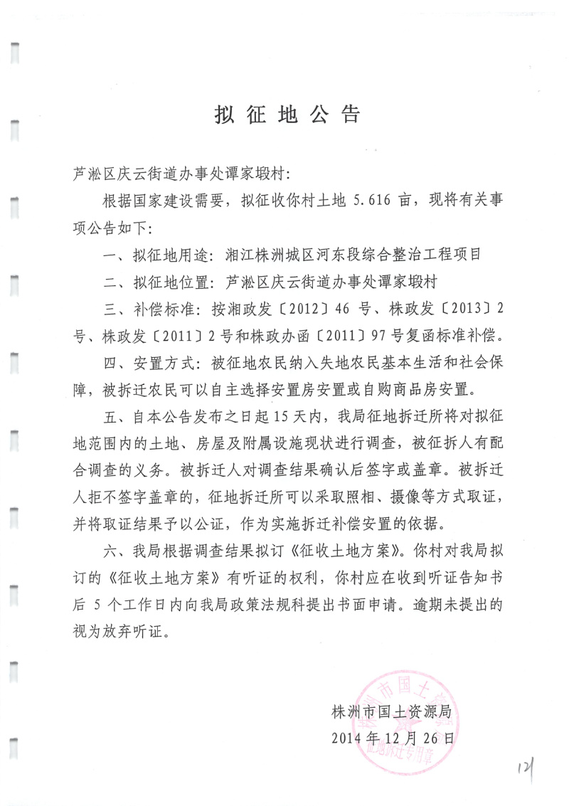 拟征地公告(湘江株洲城区河东段综合整治工程5.616亩)