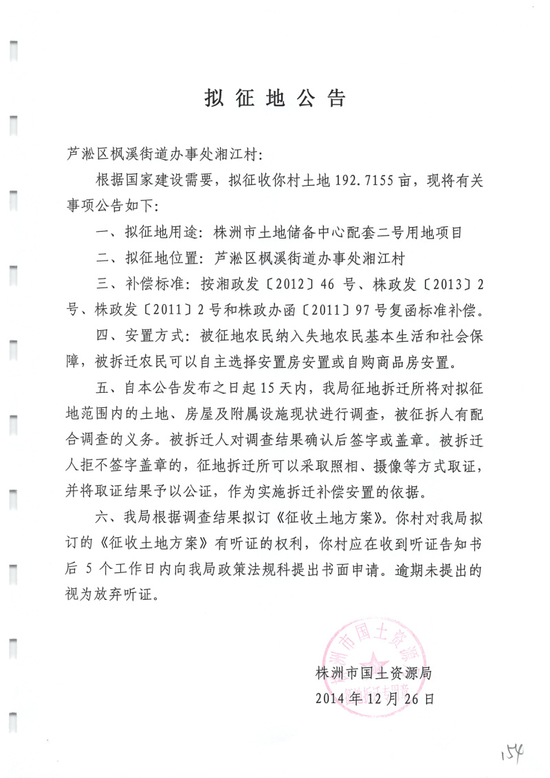拟征地公告(土地储备中心配套二号用地芦淞区枫溪街道办事处湘江村192.7155亩)