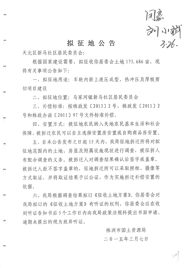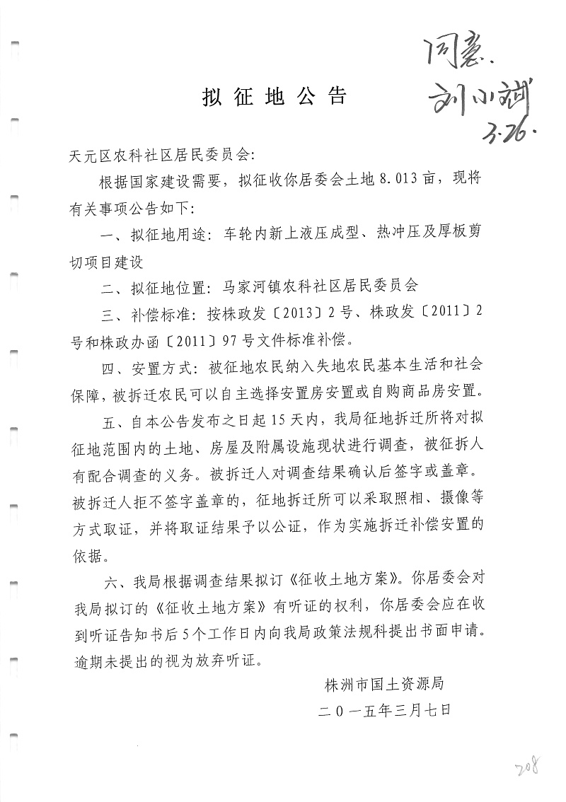 拟征地公告(车轮内新上液压成型、热冲压及厚板剪切)