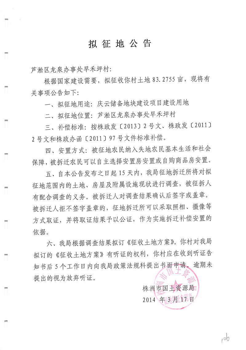 拟征地公告(庆云储备地块)早禾坪村83.2755亩