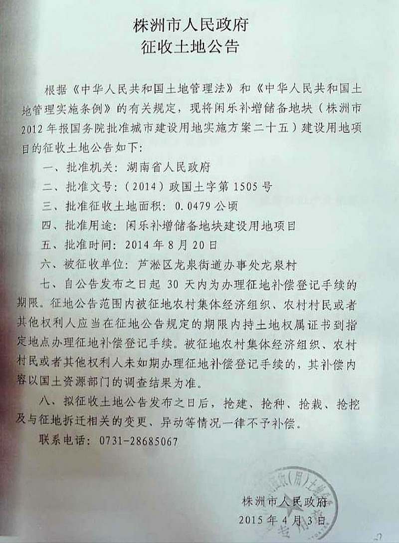 征收土地公告(闲乐补增储备地块)