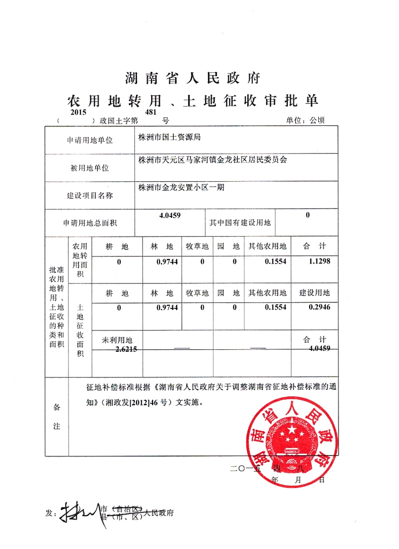 省政府农用地转用、土地征收审批单(2015)政国土字第481号