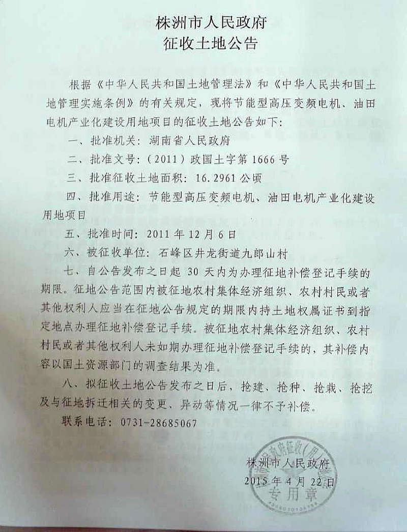 征收土地公告(节能型高压变频电机、油田电机产业化建设用地)