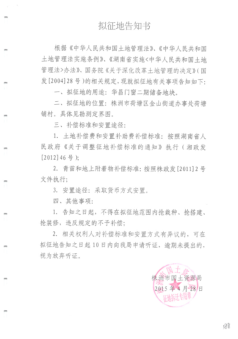 拟征地告知书(华昌门窗二期储备地块)荷塘铺村