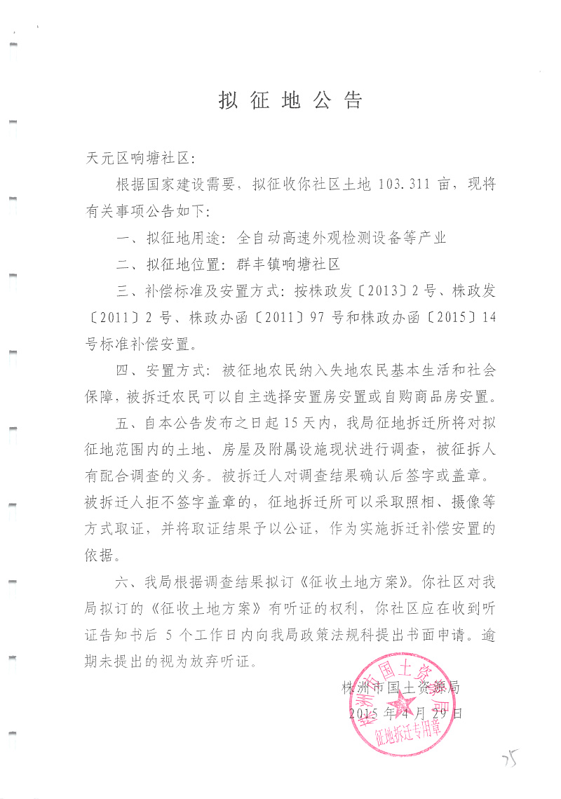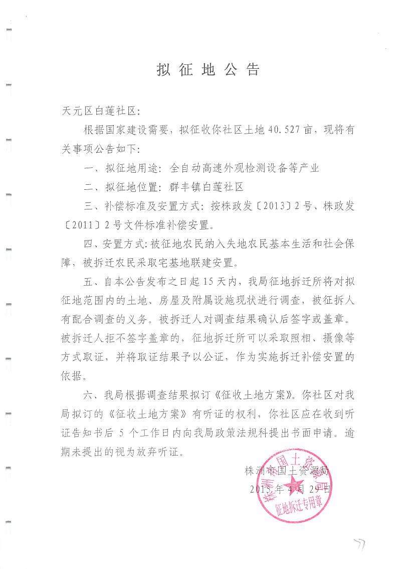 拟征地公告(全自动高速外观检测设备等产业)