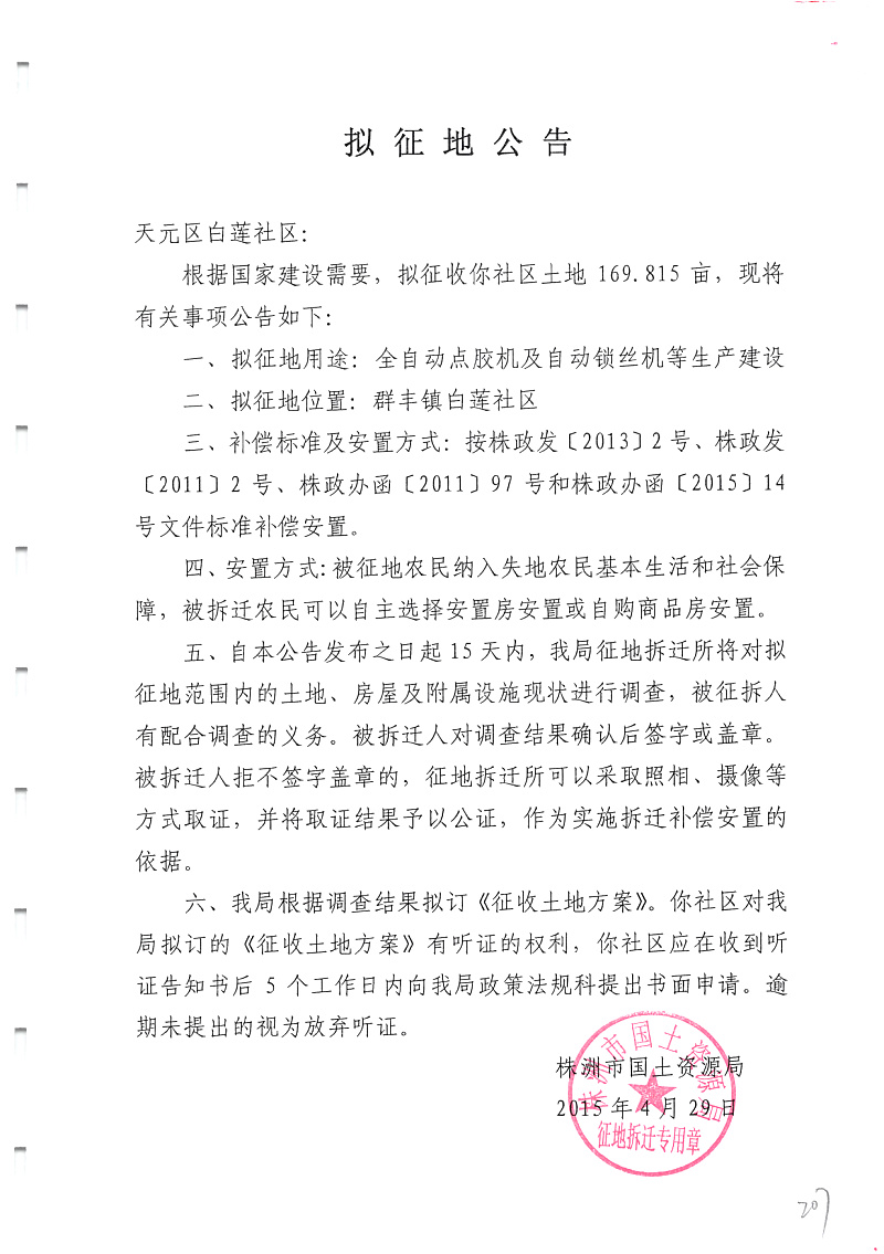 拟征地公告(全自动点胶机及自动锁丝机等生产)白莲社区169.815亩