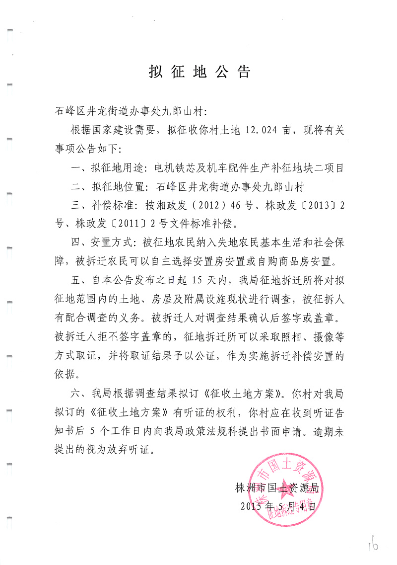 拟征地公告(电机铁芯及机车配件生产补征地块二)九郎山村12.024亩