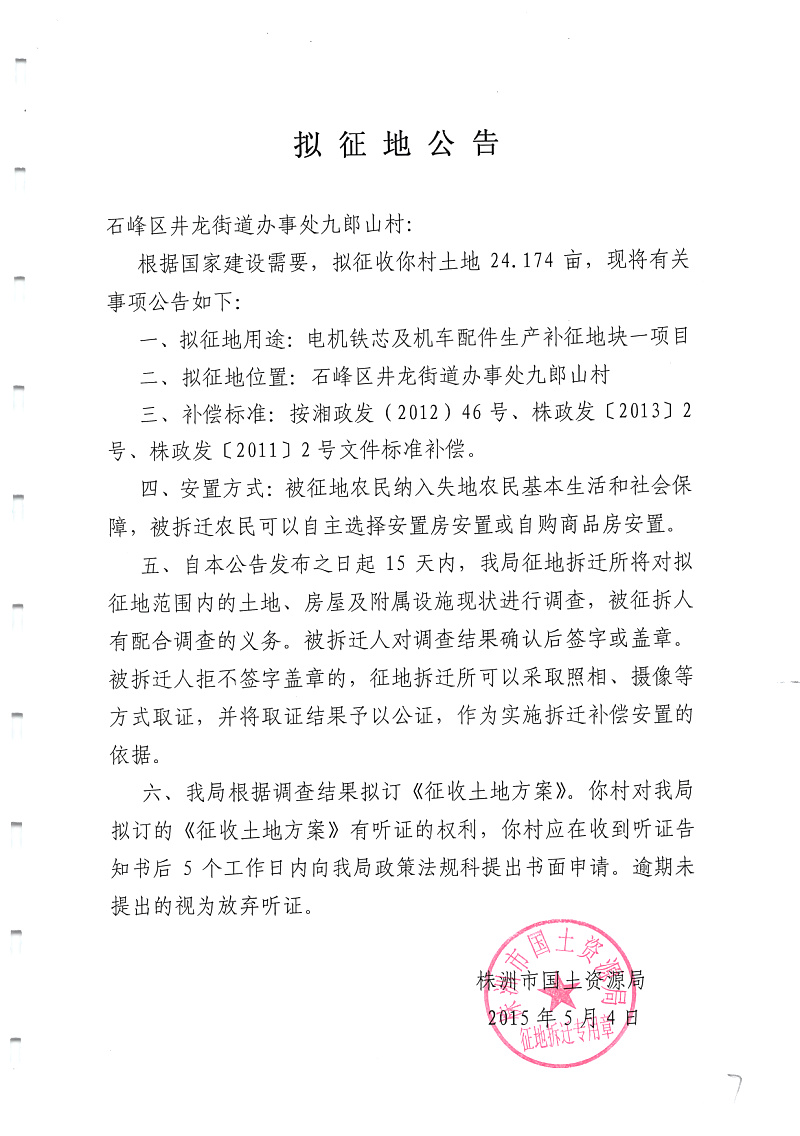 拟征地公告(电机铁芯及机车配件生产补征地块一)九郎山村24.174亩