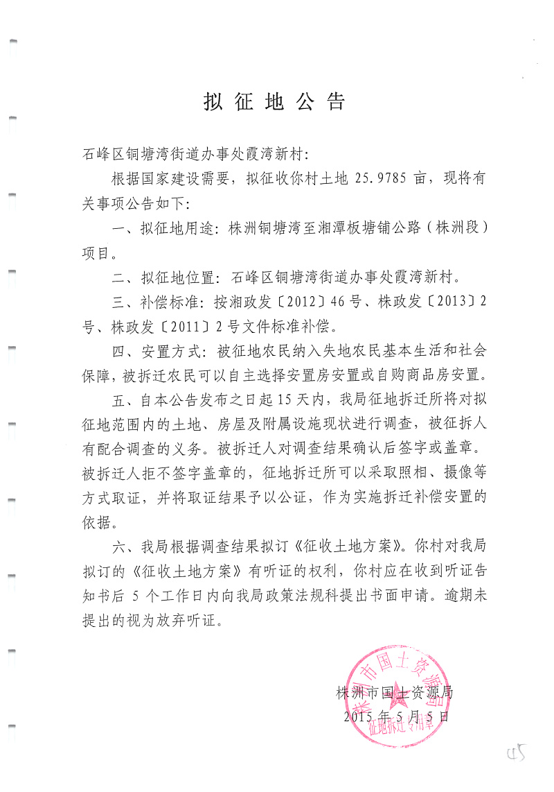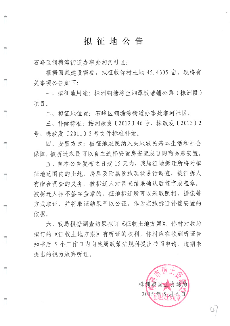 拟征地公告(铜塘湾至湘潭板塘铺公路)