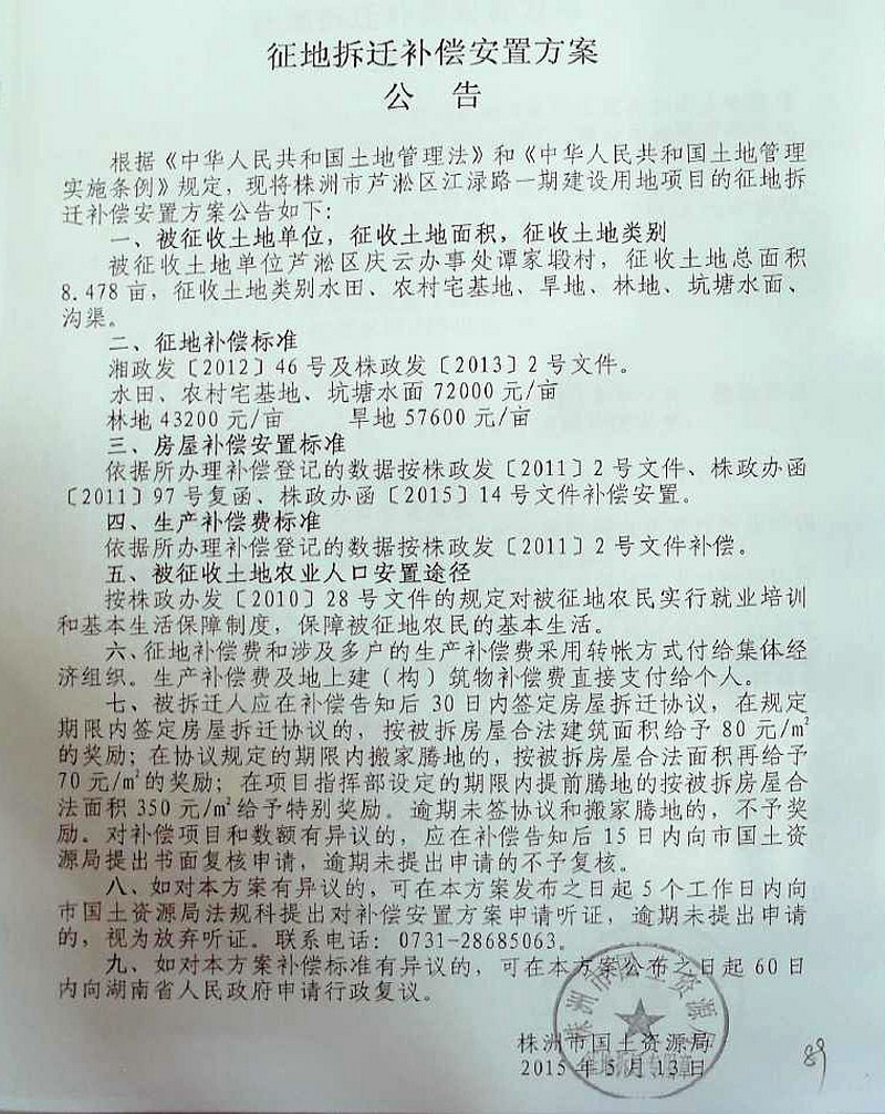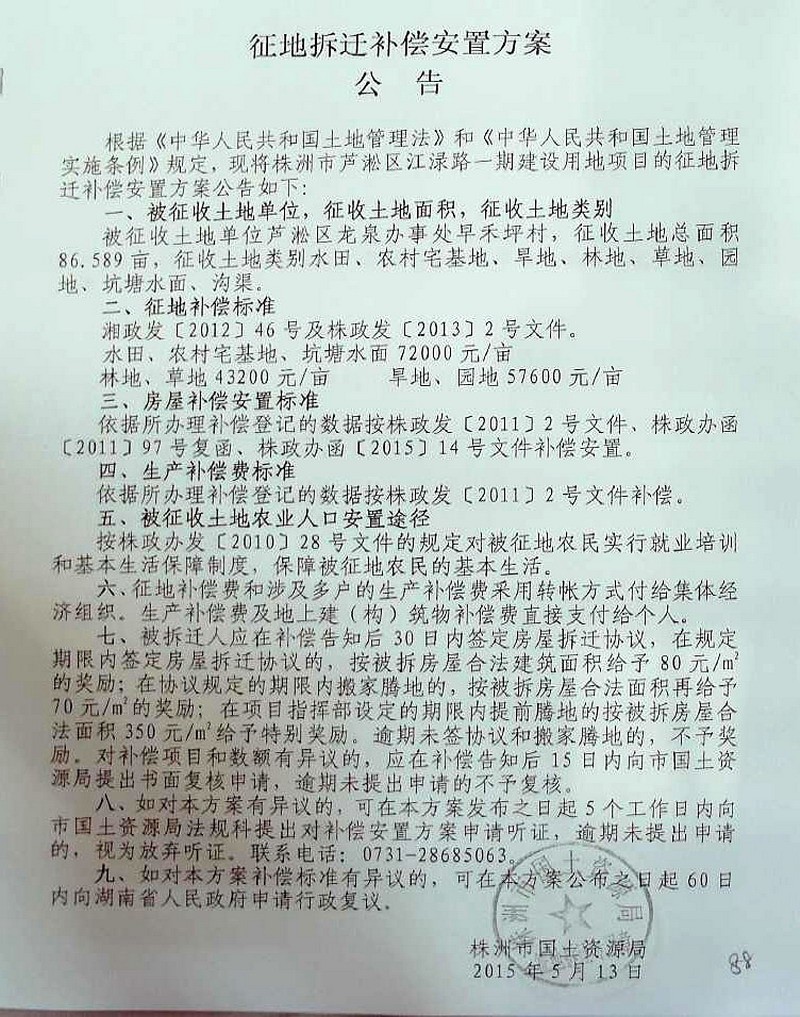 征地拆迁补偿安置方案公告(芦淞区江渌路一期)