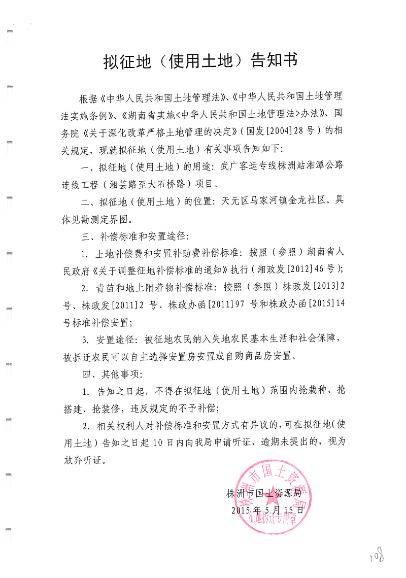 拟征地告知书(武广客运株洲站湘潭公路连线工程 湘芸路至大石桥路)