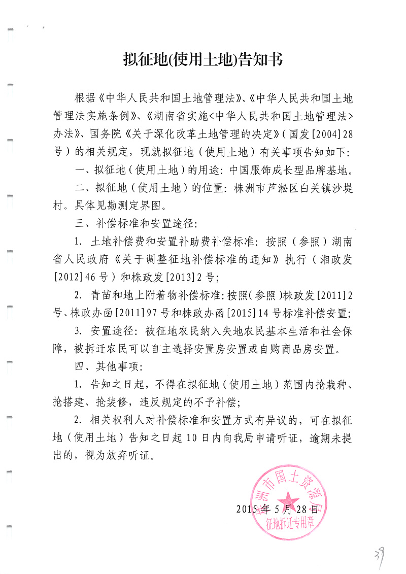 拟征地告知书(中国服饰成长型品牌基地)沙堤村