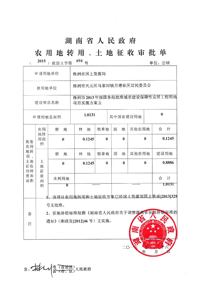 省政府农用地转用、土地征收审批单(2015)政国土字第694号