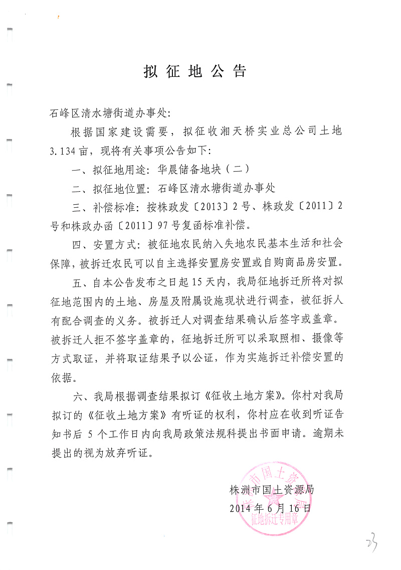 拟征地公告(华晨储备地块二)清水塘3.134亩