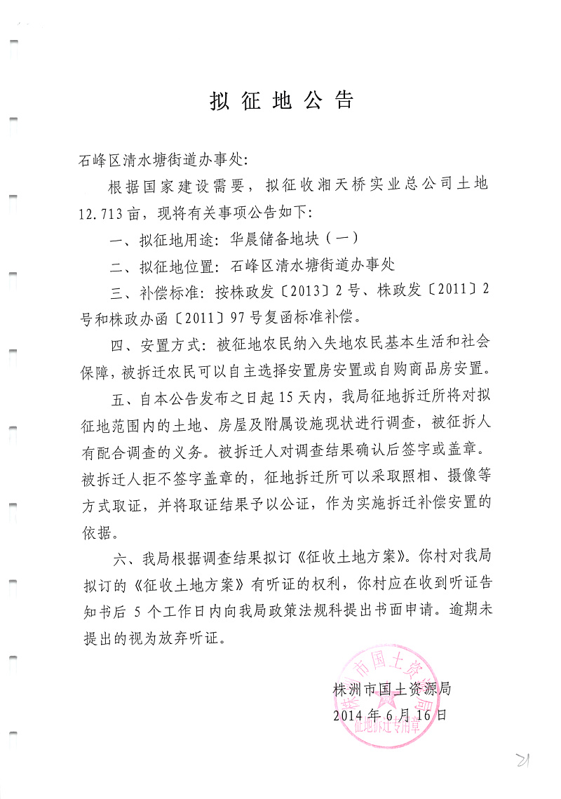 拟征地公告(华晨储备地块一)清水塘12.713亩