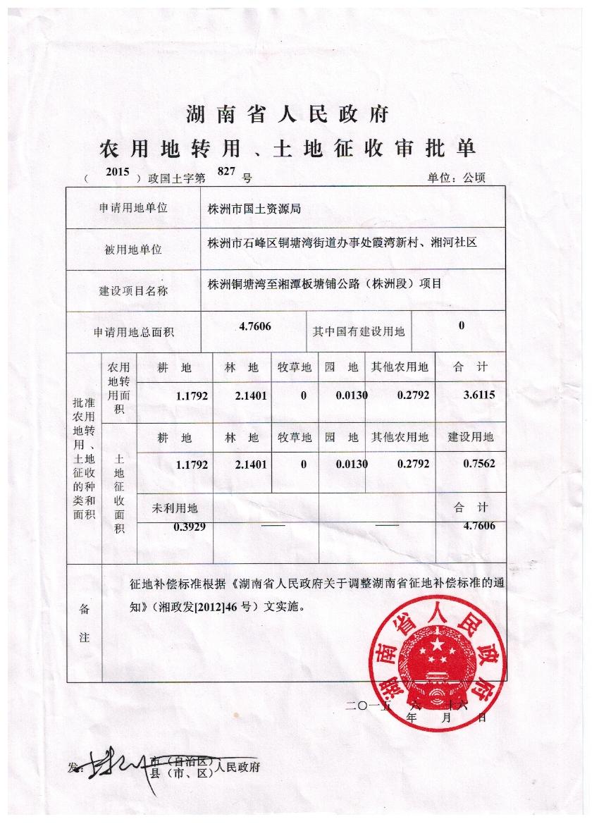 省政府农用地转用、土地征收审批单(2015)政国土字第827号