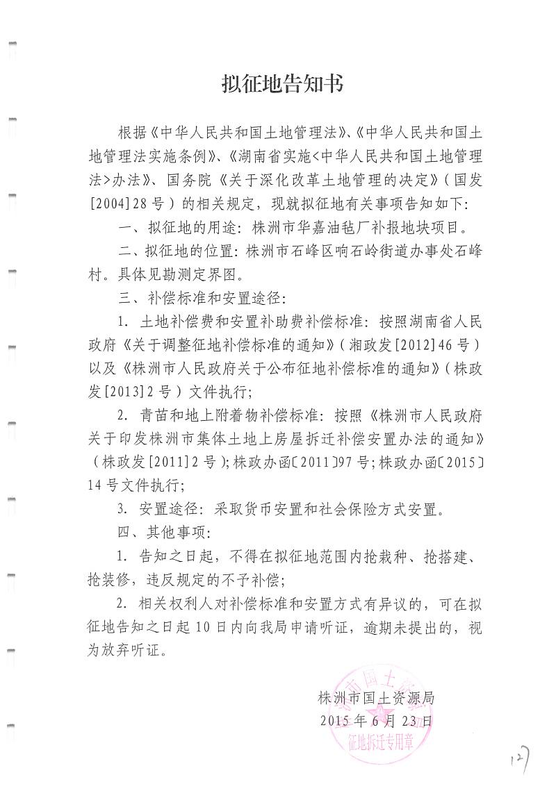 拟征地告知书(华嘉油毡厂补报地块)石峰村