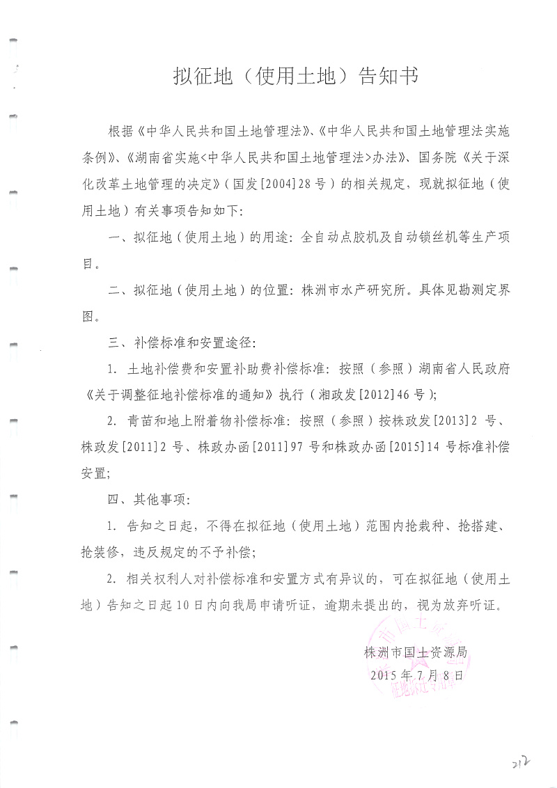 拟征地告知书(全自动点胶机及自动锁丝机等生产项目)水产研究所