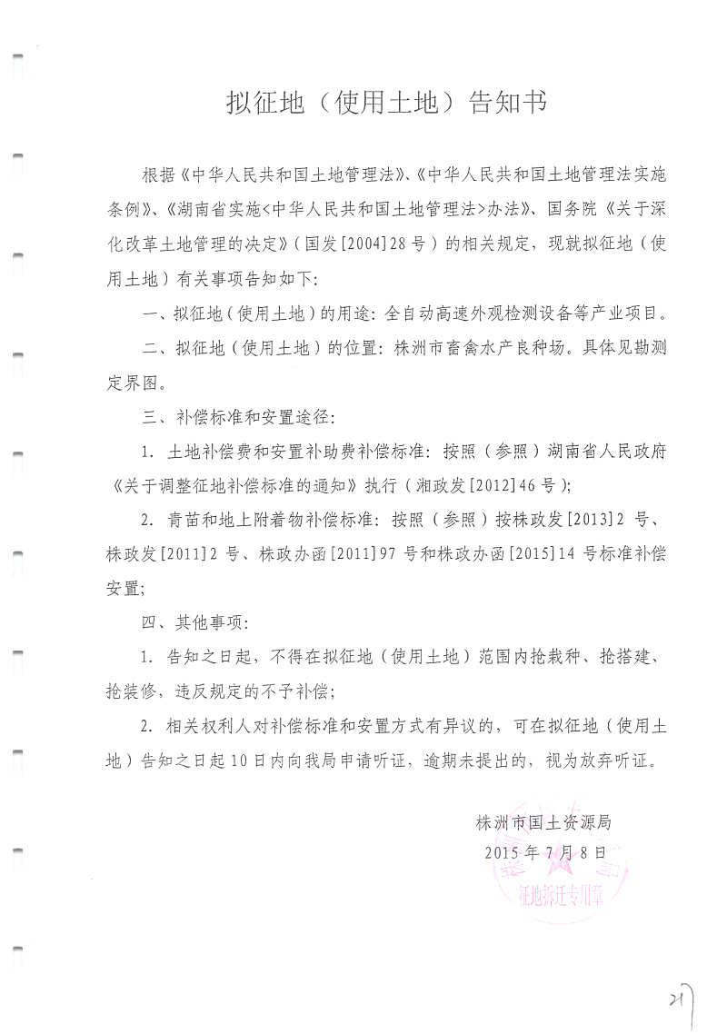 拟征地告知书(全自动高速外观检测设备等产业项目)畜禽水产良种场