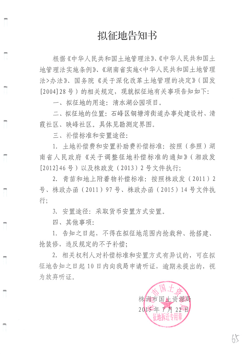 拟征地告知书(清水湖公园)建设村、清霞社区、映峰社区