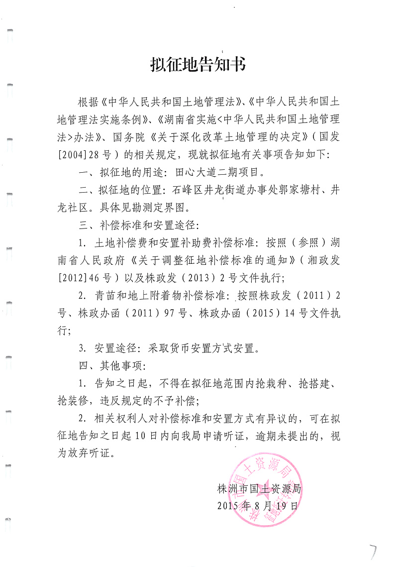 拟征地告知书(田心大道二期)郭家塘村、井龙社区