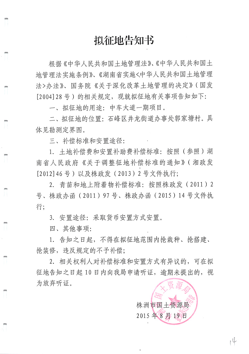 拟征地告知书(中车大道一期)郭家塘村