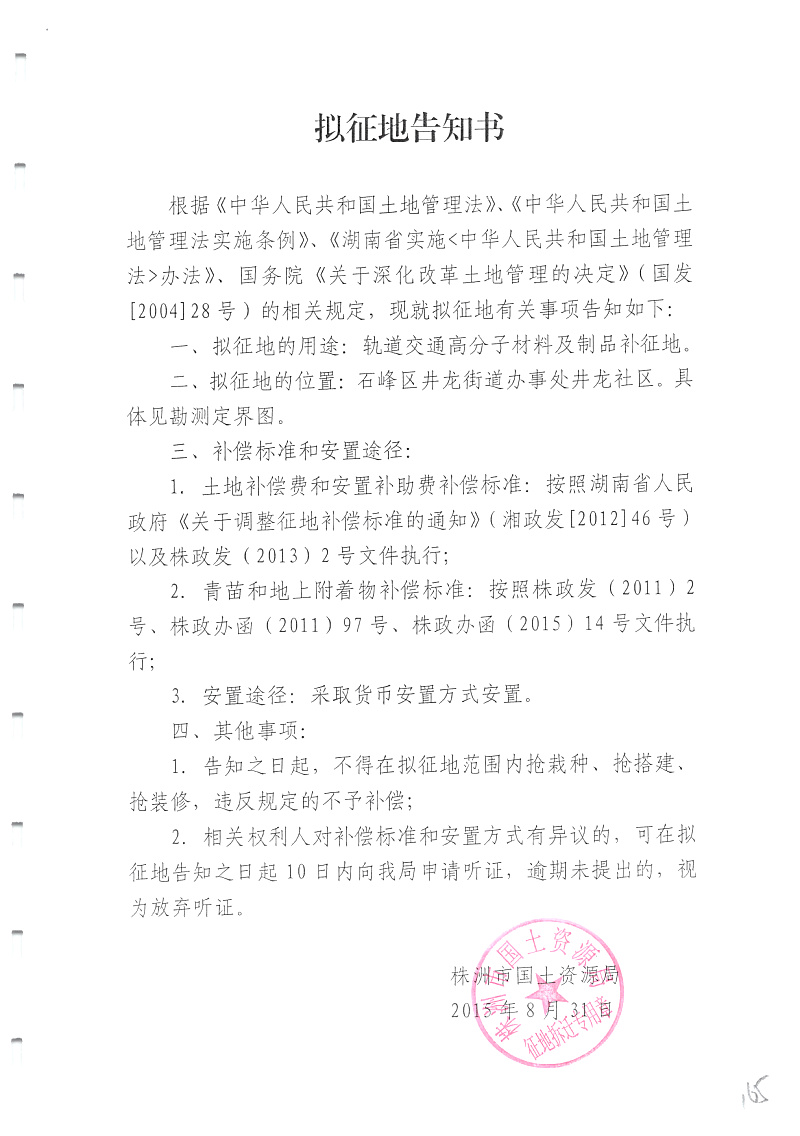 拟征地告知书(轨道交通高分子材料及制品补征地)井龙社区