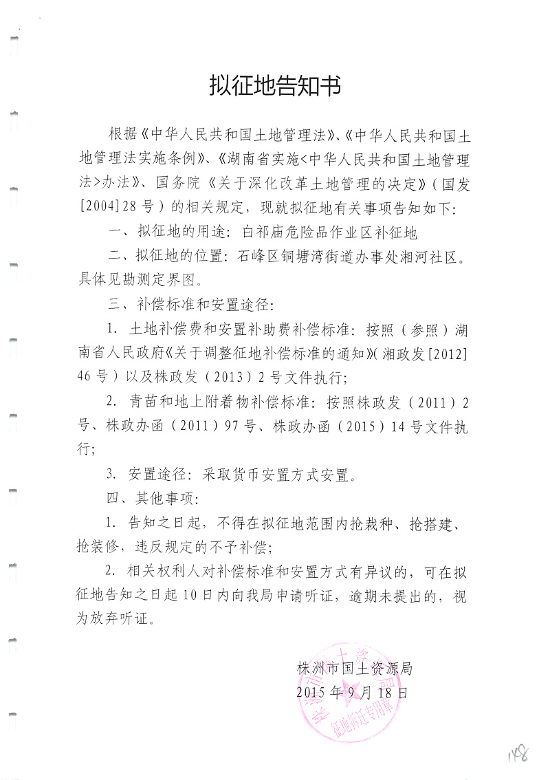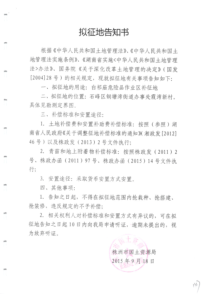 拟征地告知书(白祁庙危险品作业区补征地)