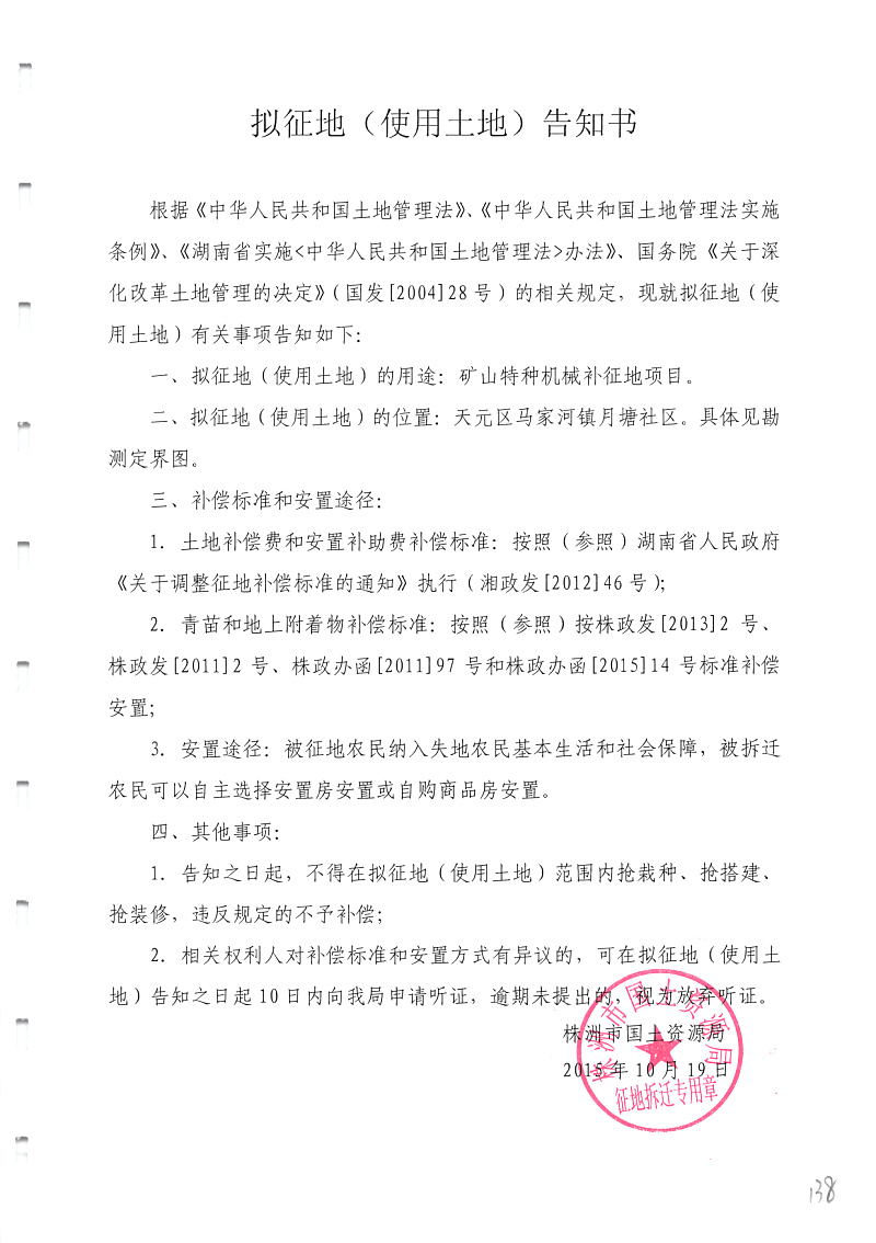 拟征地告知书(矿山特种机械补征地)月塘社区