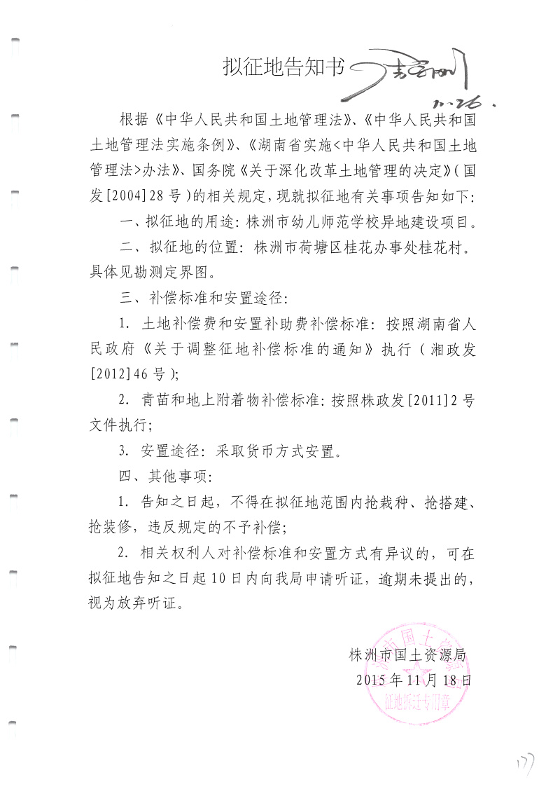 拟征地告知书(幼儿师范学校异地建设)桂花村