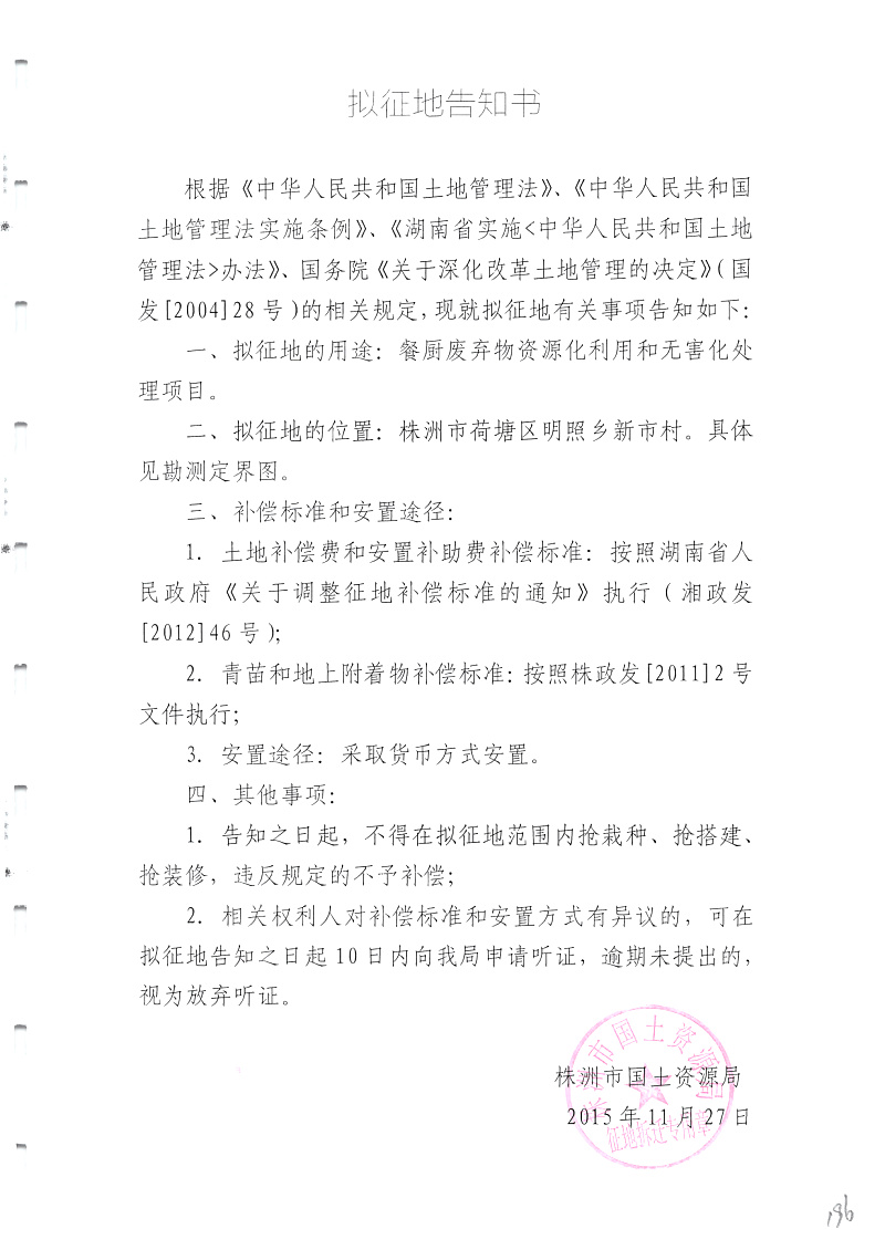 拟征地告知书(餐厨废弃物资源化利用和无害化处理)新市村