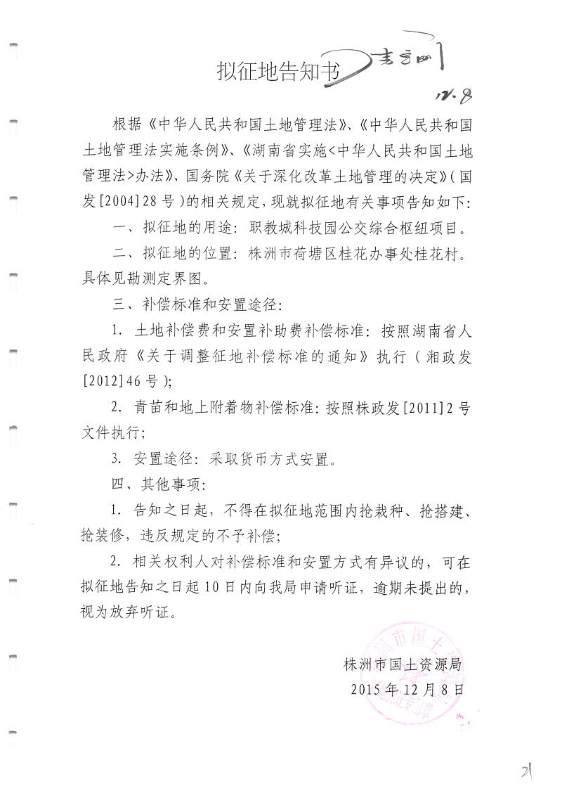 拟征地告知书(职教城科技园公交综合枢纽项目)桂花村