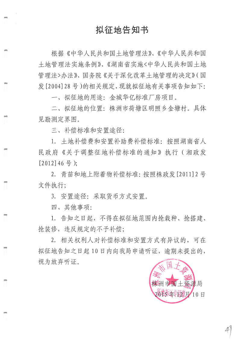拟征地告知书(金城华亿标准厂房)金塘村