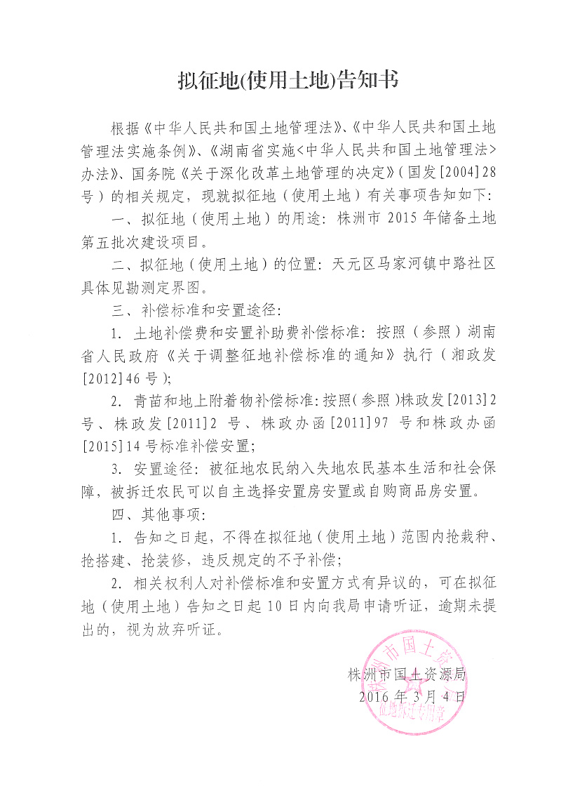 拟征地告知书(2015年储备土地第五批次中路社区)