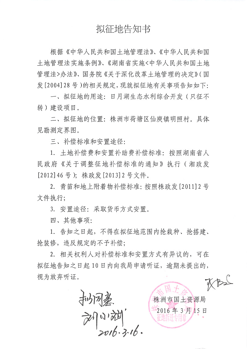 拟征地告知书(荷塘区日月湖生态水利综合开发只征不转)
