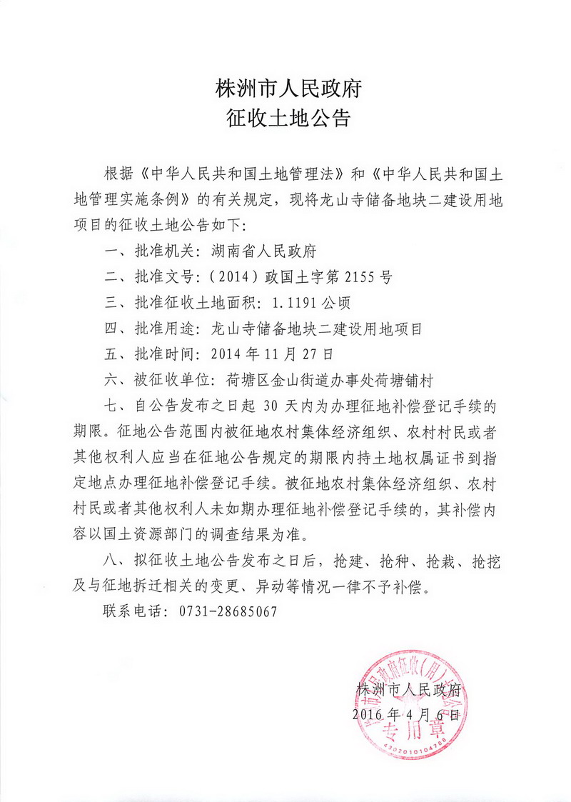 征地公告-龙山寺储备地块二