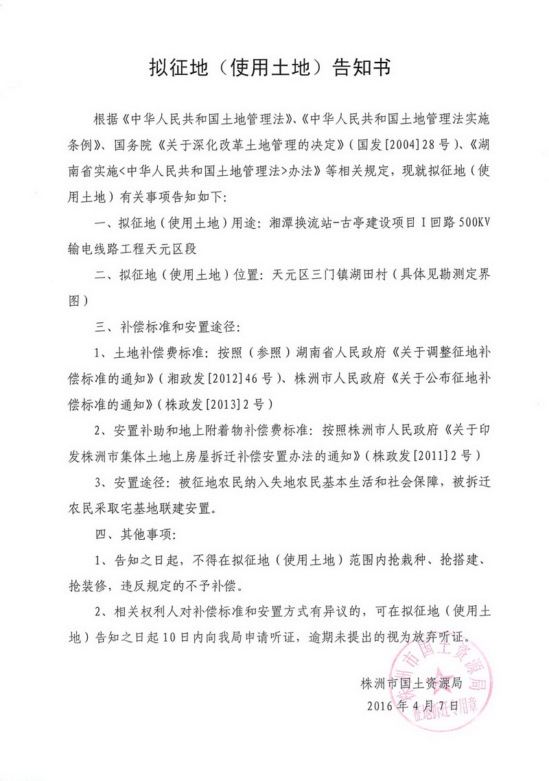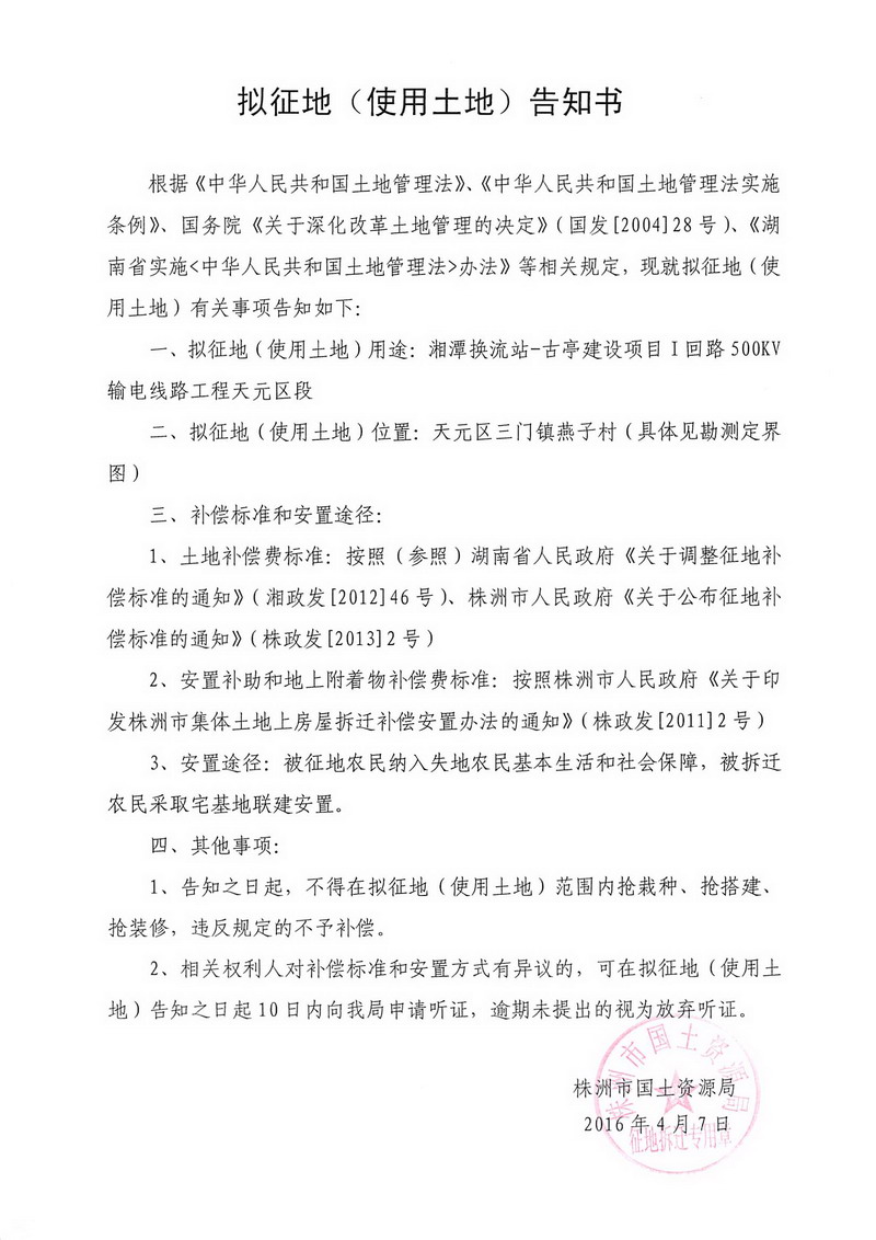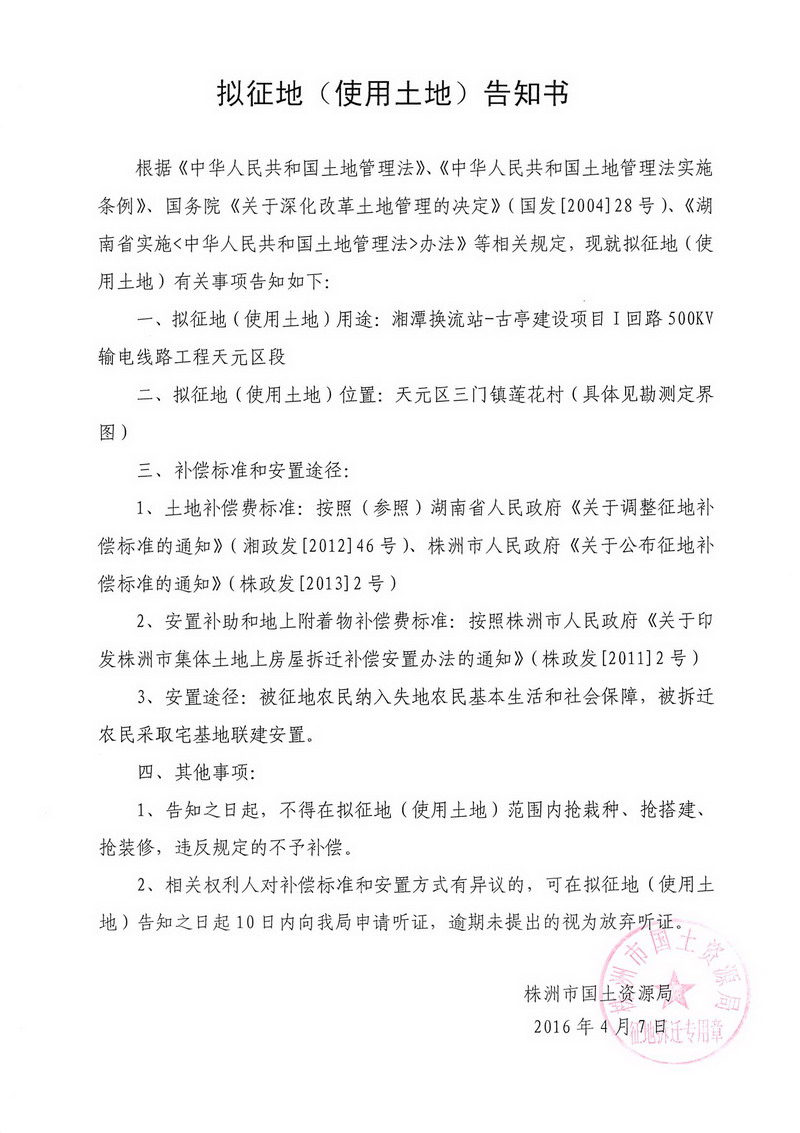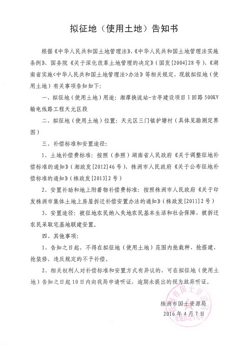 拟征地公告-湘潭换流站-古亭建设项目1回路天元区段