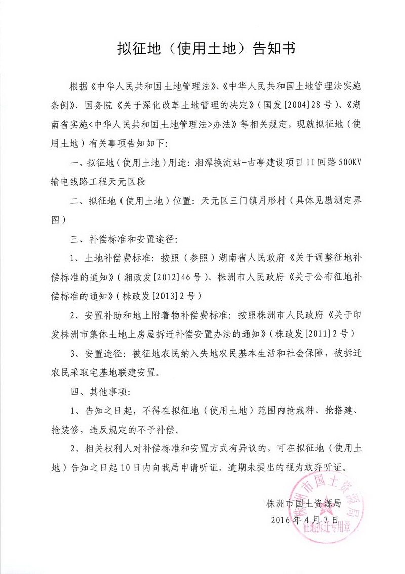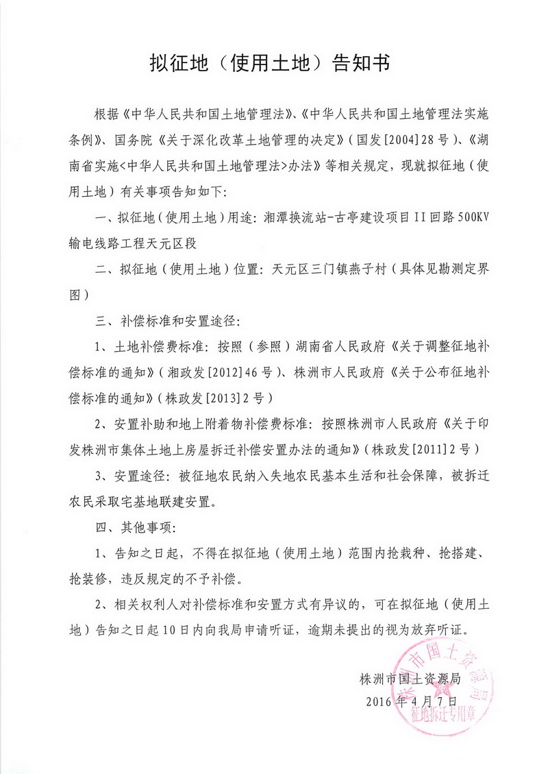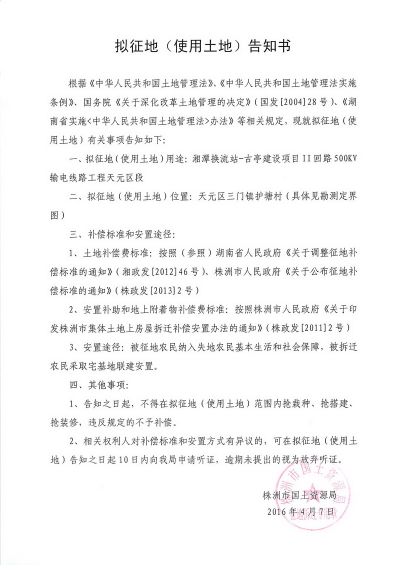 拟征地公告-湘潭换流站-古亭建设项目2回路天元区段