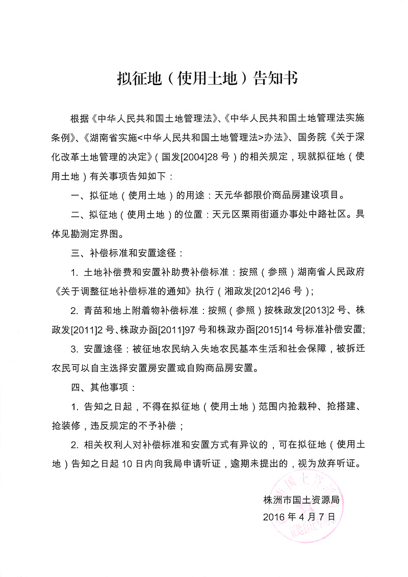 拟征地公告-天元华都限价商品房
