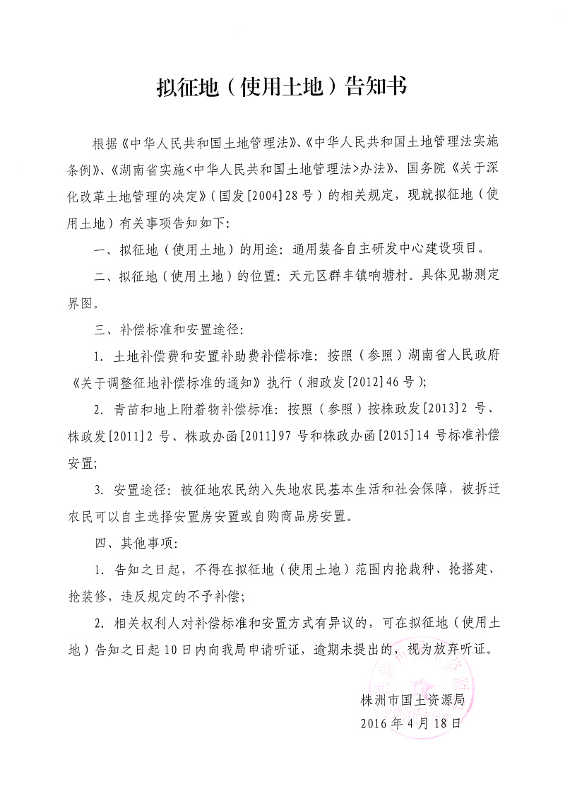 拟征地公告-通用装备自主研发中心