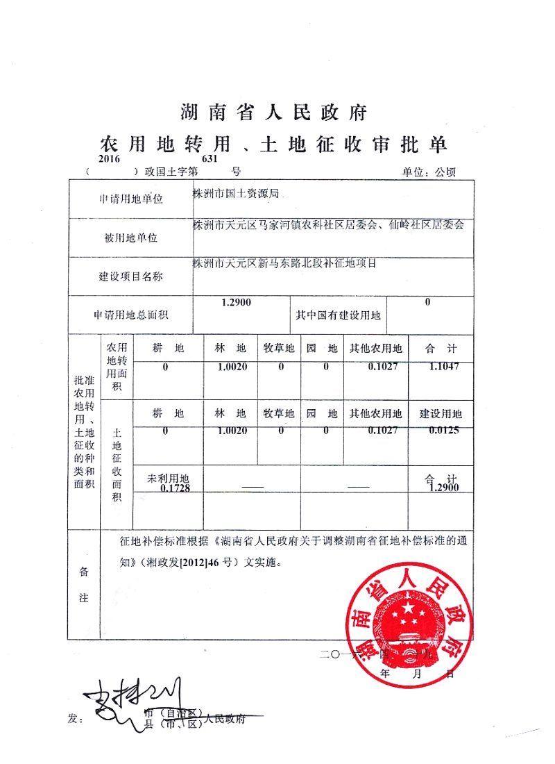 株洲市天元区新马东路北段补征地项目(2016)政国土字第631号