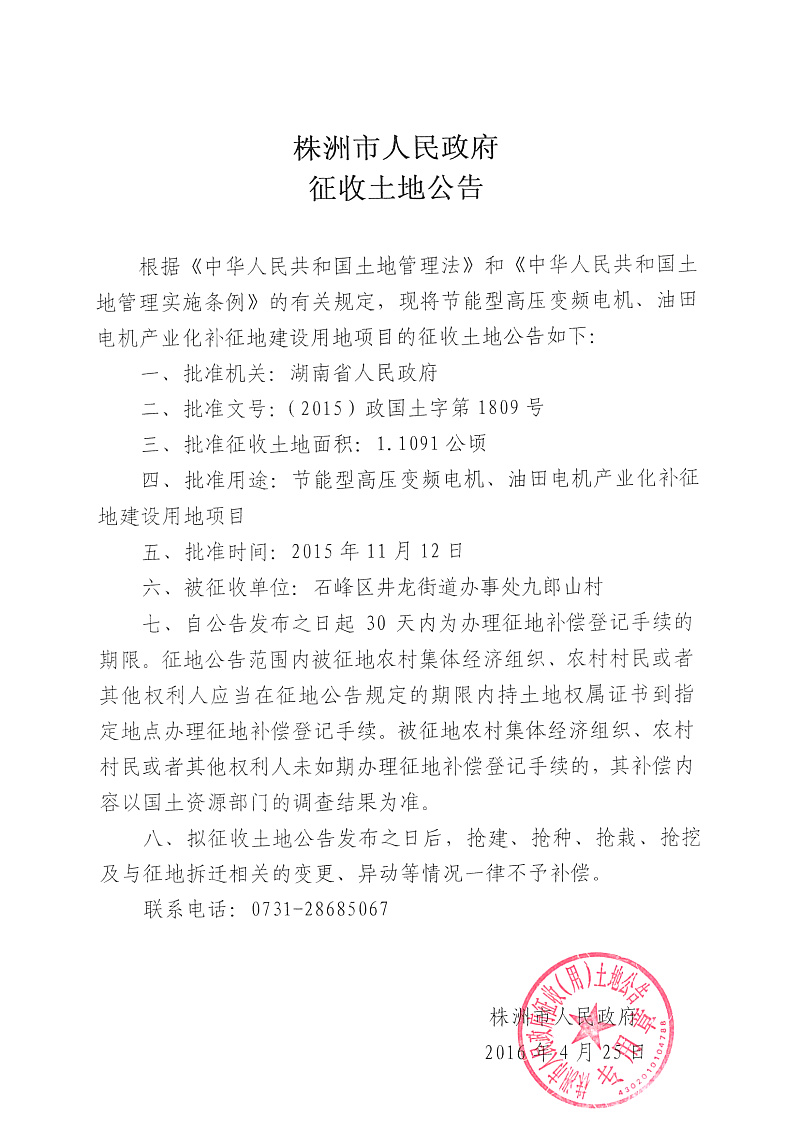 征地公告-节能型高压变频电机、油田电机产业化补征地