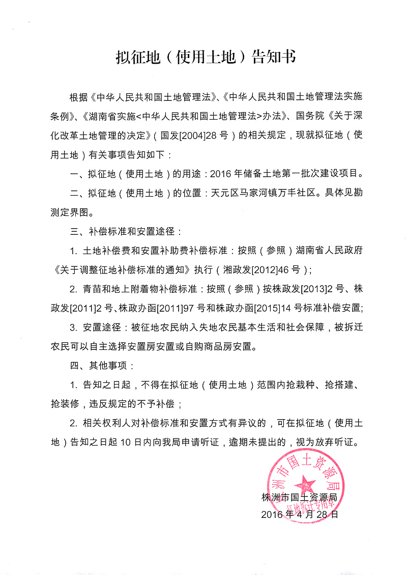 拟征地公告-2016年储备土地第一批次