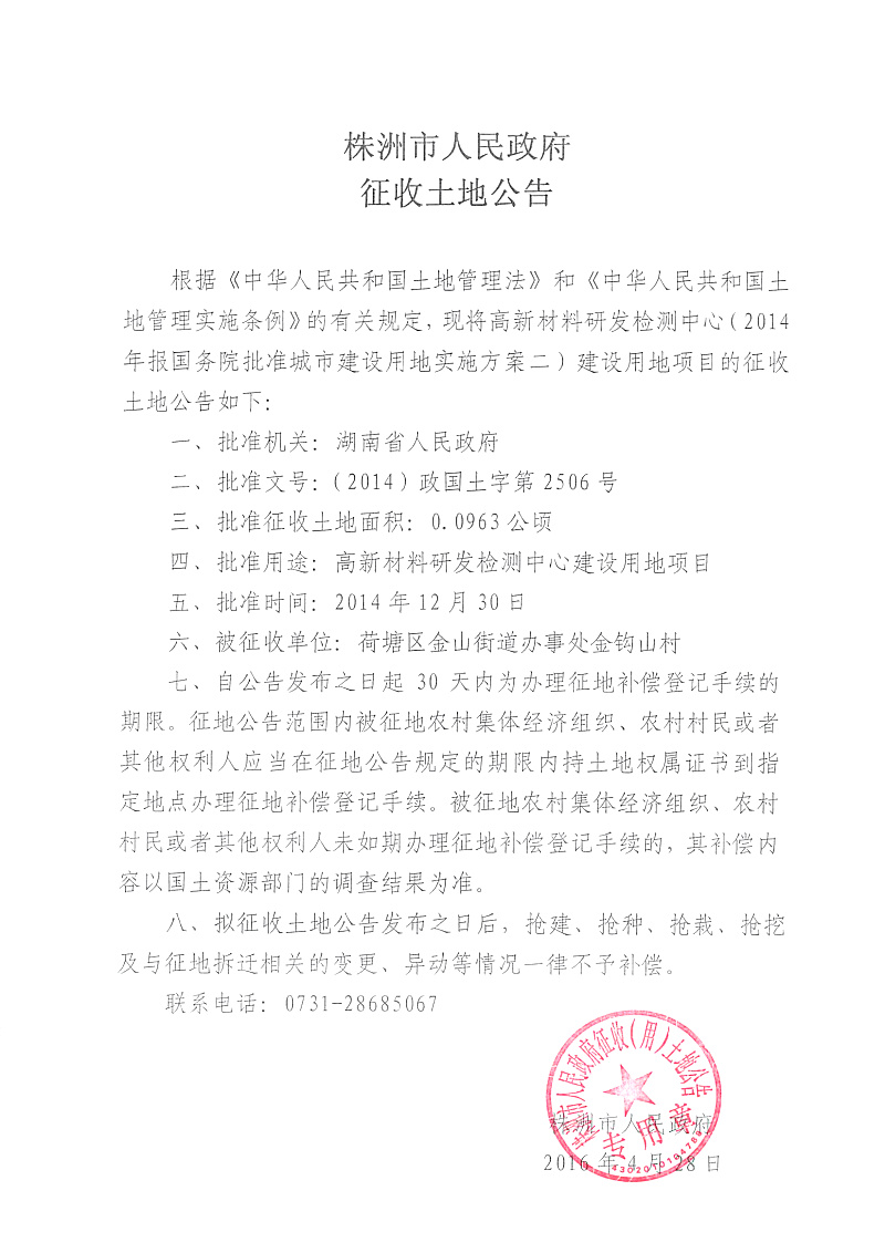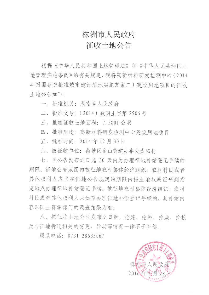 征地公告-高新材料研发检测中心(2014报国务院方案二)